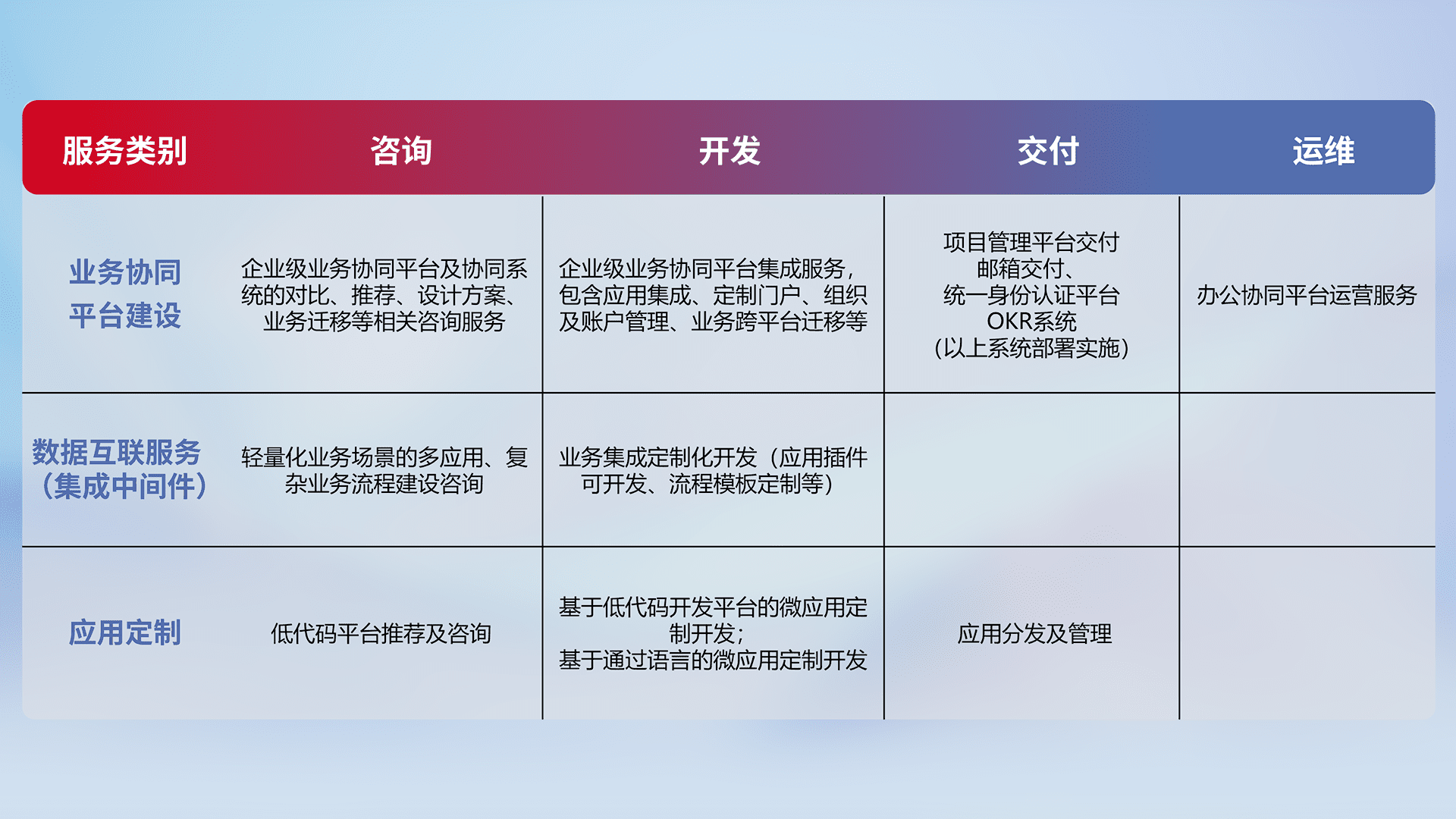 针对钉钉、、、企微、、IDaas等平台级产品提供产品的规划、、、方案、、、交付、、、定制化开发等服务,,,,实现如统一协同办公、、、、智能客户服务、、混合会议管理、、智能数据查询、、、等业务场景,,,,实现数字化转型。。。